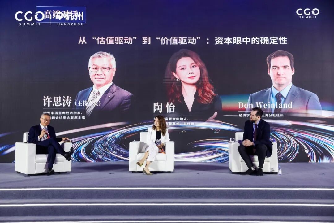 演讲结束后,许思涛继续对话好买财富联合创始人、好买基金董事长、总经理陶怡和经济学人杂志上海分社社长Don Weinland,共同探讨资本眼中增长的确定性。